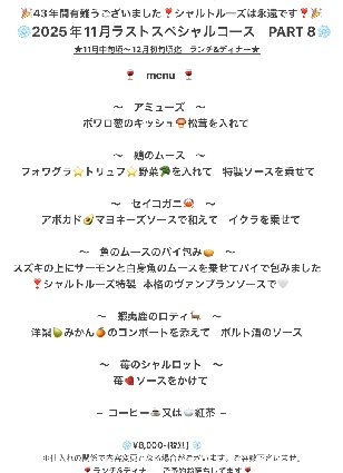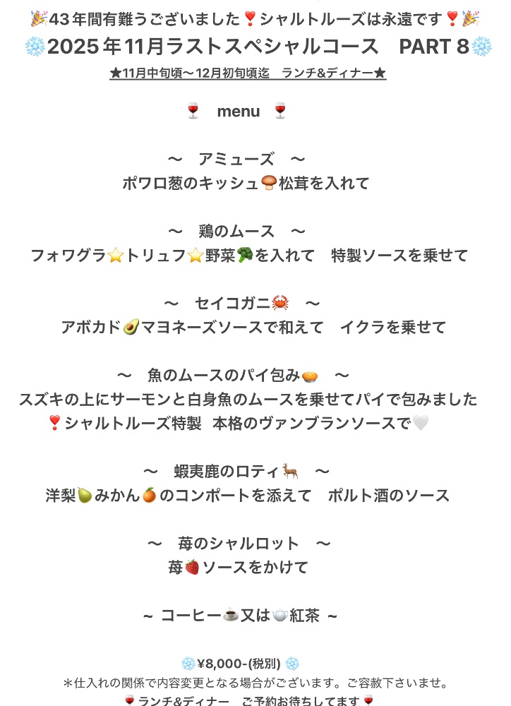 シャルトルーズは今年12/5頃に閉店となります。工事の関係ではっきりとせずすみません。決まり次第報告します。新ためて皆様へご挨拶させて下さいませ。